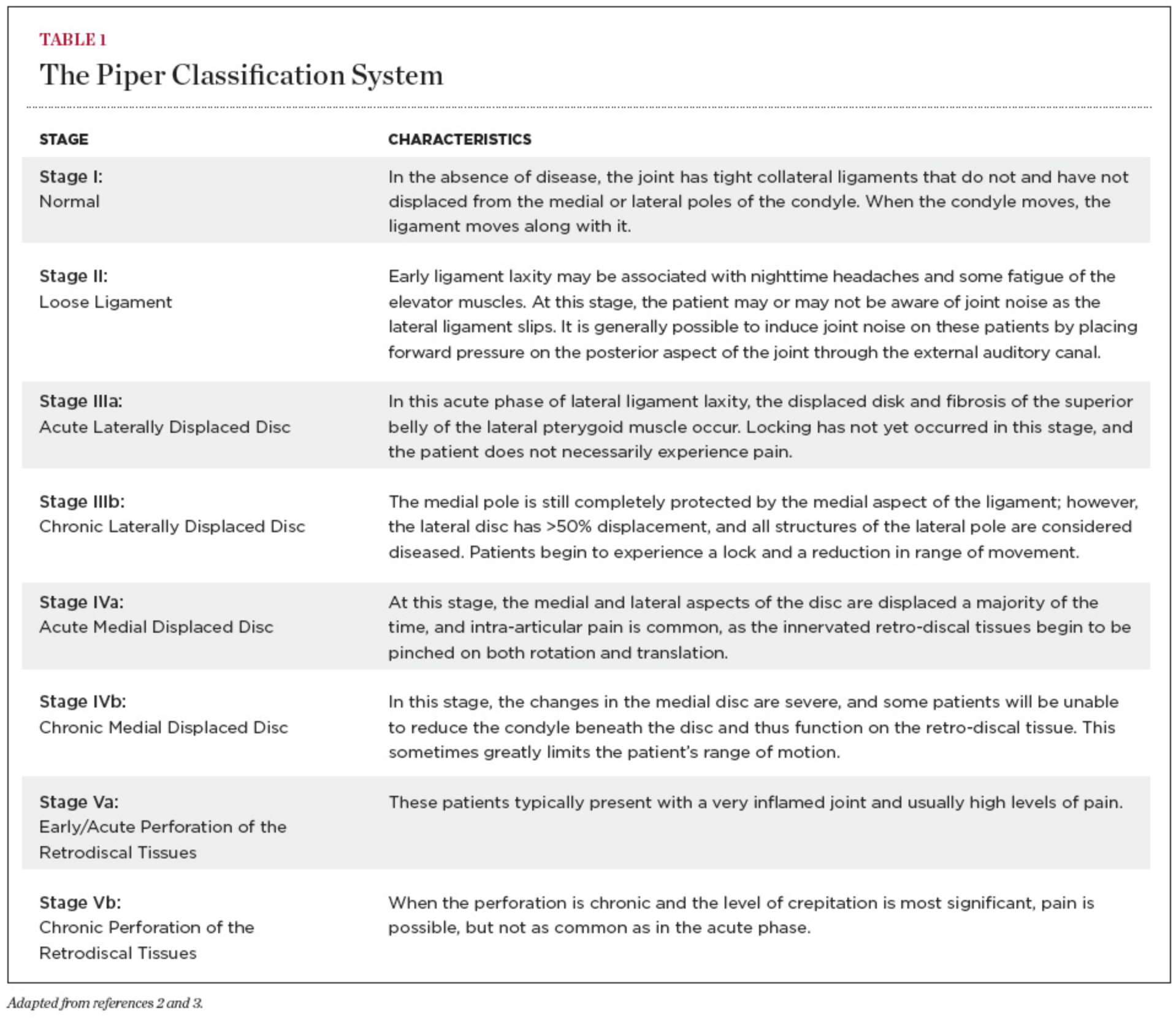 An elegant classification system created by Mark Piper, DMD, MD, offers a presumptive diagnosis of the jaw joint.2 This method, which can be quickly learned, requires no expensive diagnostic aids and can be implemented quickly during a patient encounter. Eight separate categorizations are grouped as five stages, I to V, where I is normal and V is the most chronically diseased state, in which the entire disk has displaced and a chronic perforation of the retrodiscal tissue has occurred (Table 1).