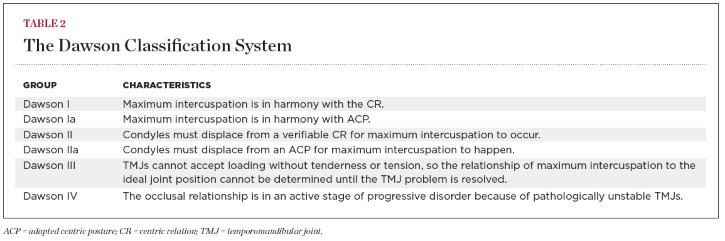 Similar to the Piper Classification System, the Dawson Classification has general categories and subcategories, with a total of six separate groups (Table 2). The first two categories (I and II) describe a joint that is stable enough to relate the occlusion to the joint. Both are subdivided into the primary form of the classification or the subgrouping identified with “a,” depending on whether the patient has an unaltered centric relation (CR) or if he/she has an adapted centric posture (ACP). ACP is the manageably stable relationship of the mandible to the maxilla that is achieved when deformed temporomandibular joints have adapted to a degree that they can comfortably accept firm loading when completely seated at the most superior position against the eminentiae. Dawson groups III and IV describe a jaw joint that is painful to load, or unstable, making a distinction about a patient occlusion uncertain.