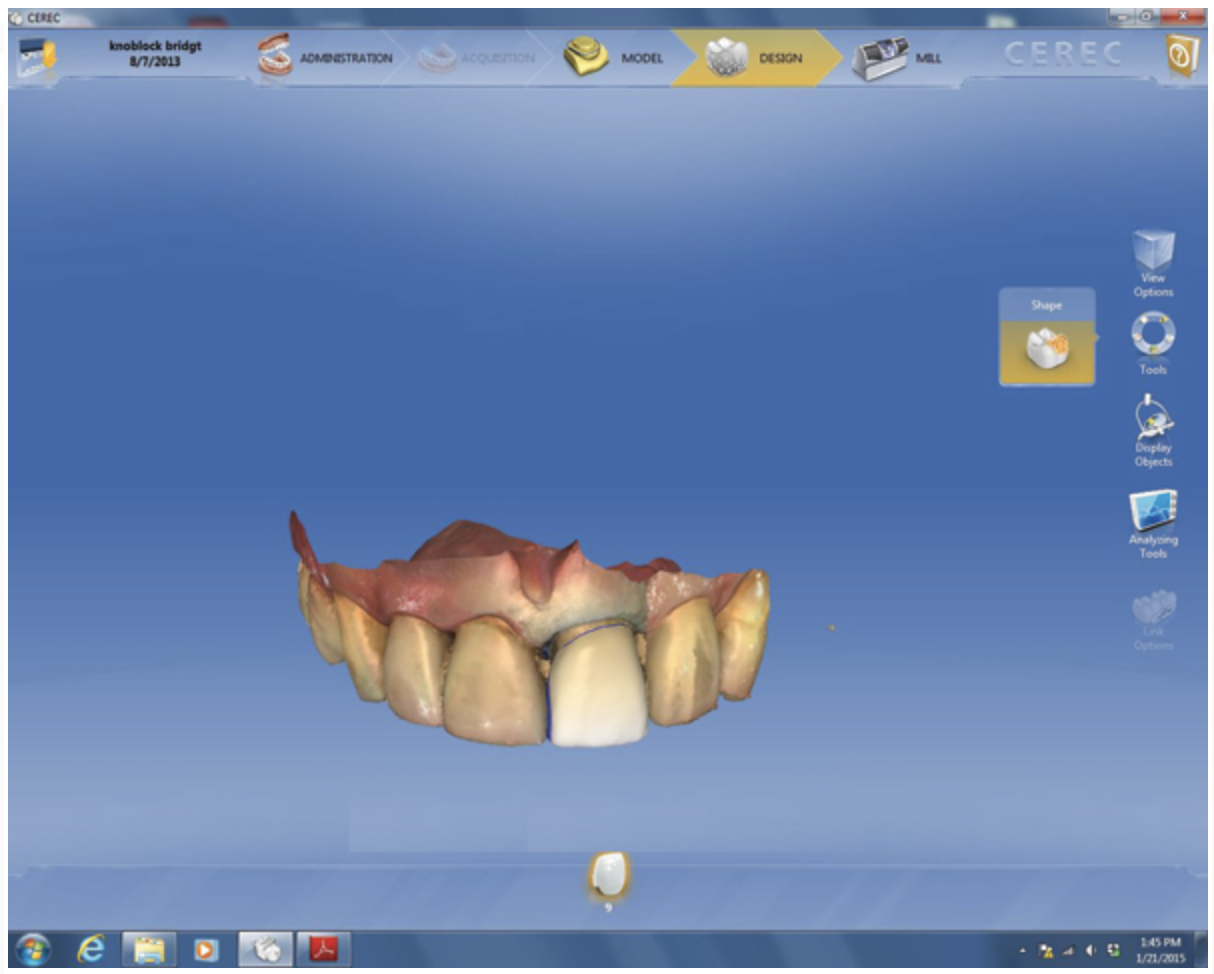 The veneer on No. 9 was then completely removed and the tooth prepared. A scan of the preparation was taken and placed into the “Upper Arch” folder (Figure 2). The software was used to marginate the preparation, and the insertion axis was established for the new restoration. A line was drawn around the entire tooth No. 9 surface (Figure 3) to include the line angles and incisal edges, and the software proposed a restoration design exactly replicating the preoperative contours and shape (Figure 4). Minor modifications were completed using the form smooth tool on the proposed veneer (Figure 5). The proximal contacts were then verified, and the veneer was milled from a lithium disilicate block (IPS Empress® CAD Multiblock, Ivoclar Vivadent). The fit of the veneer was verified intraorally (Figure 6), after which it was polished with a bristle brush (Abbott-Robinson® Brush, Buffalo Dental Manufacturing Co., Inc., www.buffalodental.com) and polishing paste (DiaShine Fine, VHTechnologies, www.vhtechnologies.com), then seated using dental adhesive (OptiBond™ XTR, Kerr Dental, www.kerrdental.com) and resin cement (NX3 Nexus, Kerr Dental) (Figure 7).