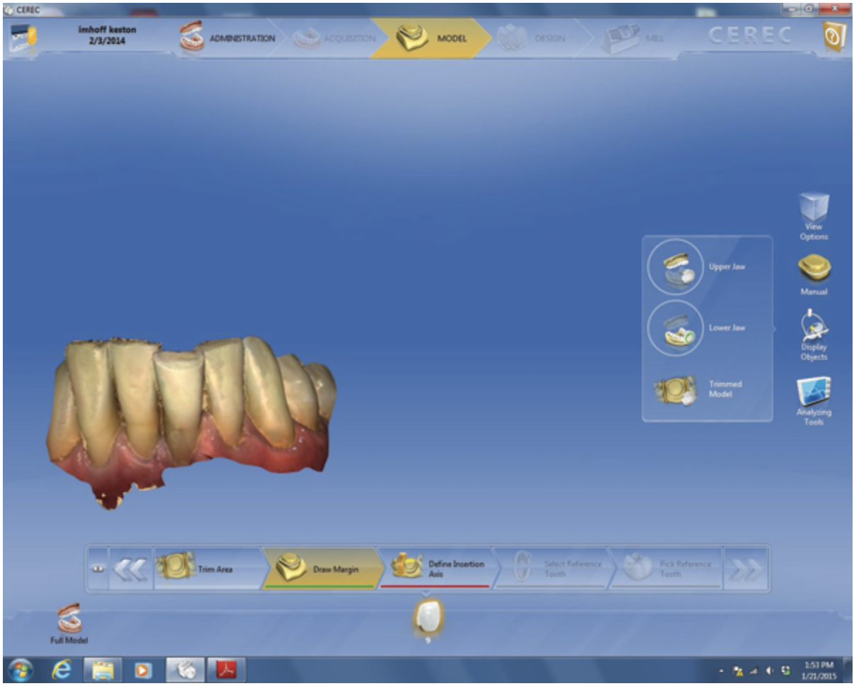 CEREC, the first chairside CAD/CAM system,14 quickly fabricates laboratory-grade chairside tooth-colored restorations (eg, full-coverage crowns, inlays/onlays, veneers) with rapid digital impression taking, simple designing, and precise machining for improved workflow and efficiency.14-16 The system’s broad spectrum of applications automates the design process for creating patient-specific restorations with easy-to-use and highly predictable and accurate software facilitating preparation and impression monitoring, so temporary restorations or conventional impressions are unnecessary.16