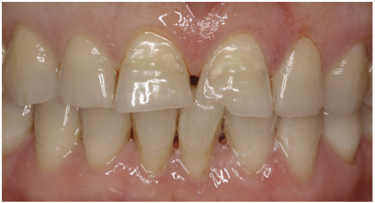 A patient presented with fractured incisal edges on teeth No. 8 and 9, with wear and diastemas between them (Figure 14). The patient’s chief desire was an even-looking smile without the dark triangle between teeth Nos. 8 and 9, and she wanted the dentistry completed in one visit. Without this request, an impression could have been sent to the laboratory for creating an ideal wax-up, which would then have enabled the biogeneric copy technique. Unfortunately, neither of the teeth to be restored demonstrated ideal form or shape, and none of the other teeth in the arch provided an ideal replicating template.