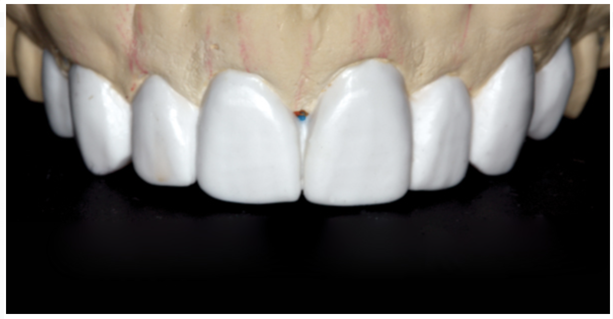 All the teeth were marginated and the correct insertion axis established for each tooth individually. The software then proposed the final eight restorations based on the copy line completed for each individual tooth. The crown designs were modified using the different tools, and ideal embrasures, line angles, and contacts were created (Figure 23). All restorations were milled from light translucency lithium disilicate blocks (IPS e.max LT BL1, Ivoclar Vivadent), which would block the dark tetracycline tooth stains. The restorations were glazed, then tried on the model to verify fit and contacts.