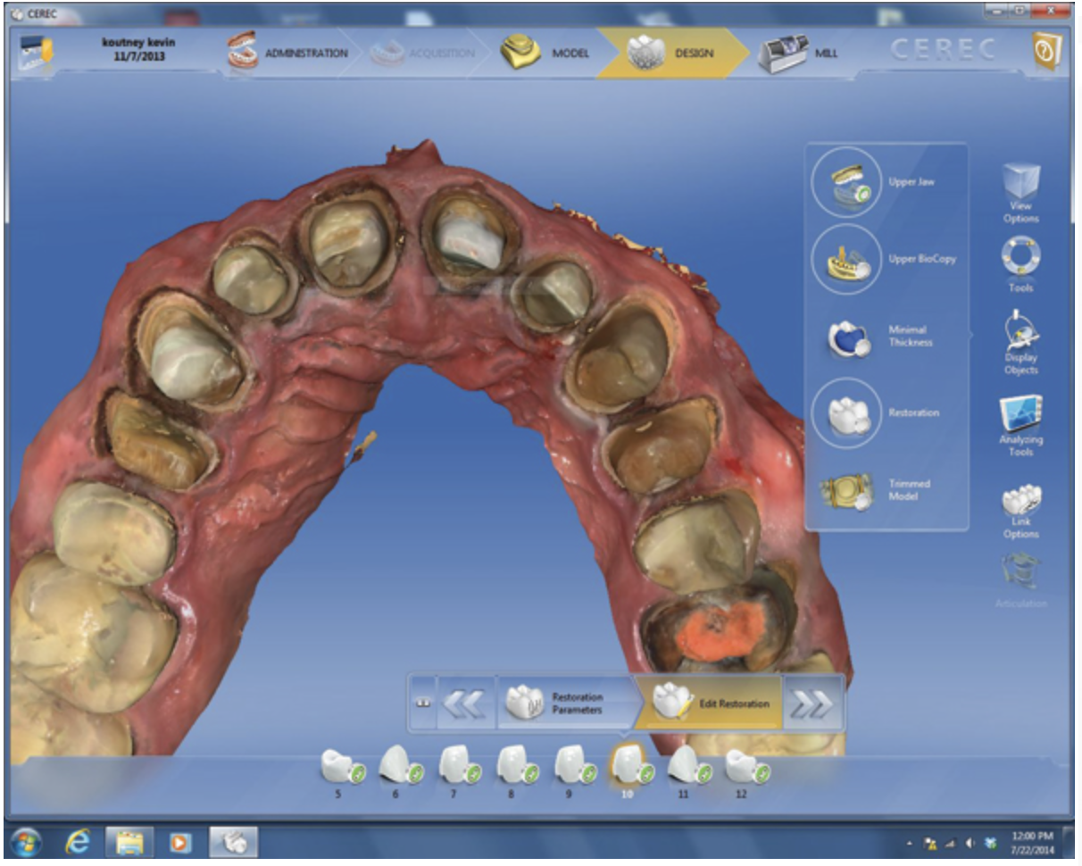CEREC simplifies and enhances restoration design with such software features as the biogeneric process, which analyzes morphologic characteristics of existing teeth and expresses them as a 3D image rendering.16 Based on the observation that a patient’s teeth exhibit similar morphologic characteristics, Mehl and Blanz developed this approach to create a valid quantitative process for calculating 3D averages of tooth surfaces, representing a principal component in evaluating the natural shape deviations from the 3D average for quickly designing restorations.17