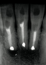 The resultant cavosurface outline is quite long and fairly narrow for the calcified tooth, and creates better potential for accuracy (Figure 18 and Figure 19). A final view of the access in Figure 20 shows the orientation of the palatal–incisal notch and the dentinal map, which is encountered as early as possible. The radiographic sequence (Figure 21, Figure 22, Figure 23 and Figure 24) teaches a new concept in accessing calcified canals, that of radiographs taken using the pointing quality of a conical bur to assess direction and position of the access cavity. Corrective steps can then be taken to avoid gouging or perforation. In the past, only endodontic files have been used as metallic (radiopaque) radiographic markers. The snug fit of a conical bur as opposed to the loose fit of a round bur facilitates the use of the bur in taking "bur instrument films."