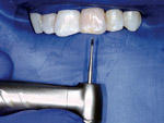 The first step in the access for the calcified tooth is the establishment of the palatal–incisal notch (Figure 15 and Figure 16). Once the area where the original pulp chamber was located has been accessed, it is advisable to take an orientation verification radiograph or multiple angled radiographs (Figure 17). The palatal–incisal notch works in concert with the narrow shaft of the bur to perform important tasks. Similar to a surgical stint for implant drilling, the notch first stabilizes and directs the head of the bur by cradling the shaft. Secondly, it allows a more appropriate angulation—toward the incisal—of the back of the bur. Anatomy lessons have taught clinicians that the root and the crown of incisors are not parallel.