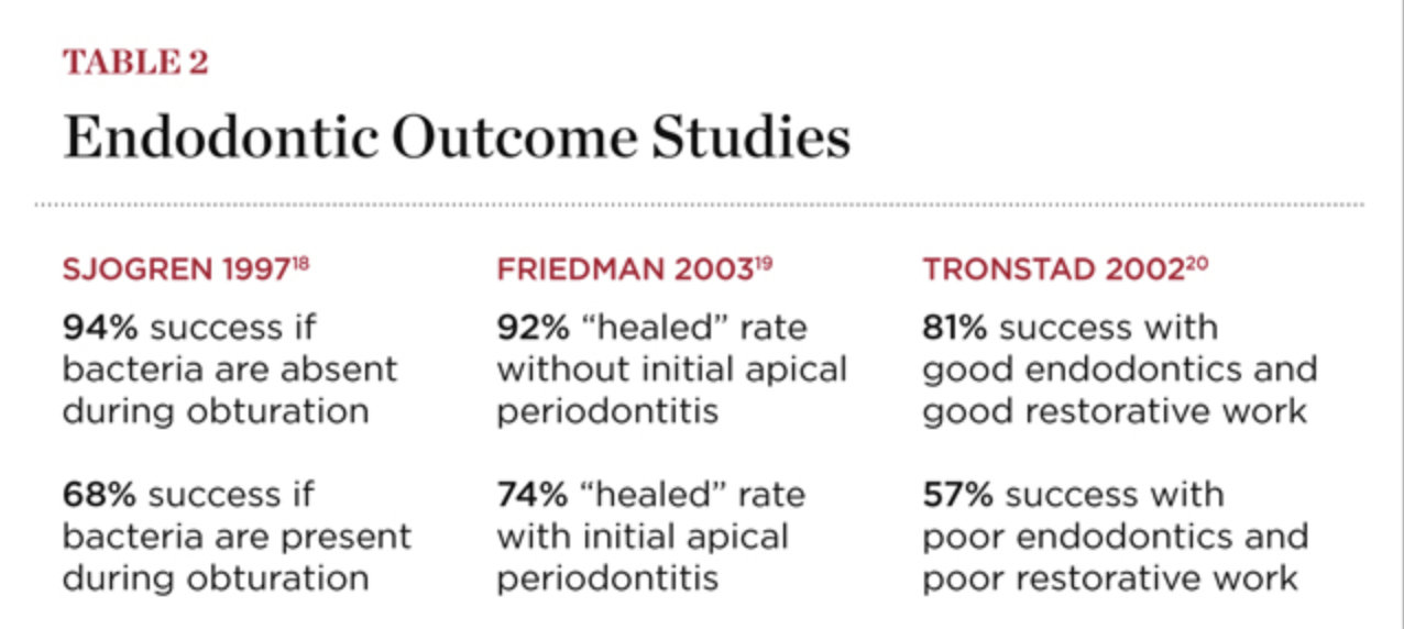 Endodontic success/failure rates and comparisons to implant success/failure rates is currently a hot topic. Endodontic outcome study results are so diverse that it is difficult to obtain a general sense of predictability. Is endodontics 95% successful, or only 75% successful? If it is only 75% successful, then the implantologists are right, and implants are certainly a better option. As the gatekeepers, restorative dentists are obligated to fully understand whether implants or endodontics are truly in the patient's best interest. Interpreting endodontic outcome studies is incredibly complicated. Variables include tooth type (singlerooted or multi-rooted), sample size, and case selection. Treatment options are variable, and providers, techniques, culturing, and the subsequent restoration are all factors with a strong influence. The methodology of the studies is critical, and these factors include the study design, recall rate, radiographic interpretation, follow-up period and, finally, analysis. Outcome studies used by the American Association of Endodontists and other endodontic advocates often differ from those of implantologists, as they engage in healthy skirmishes over dental turf.