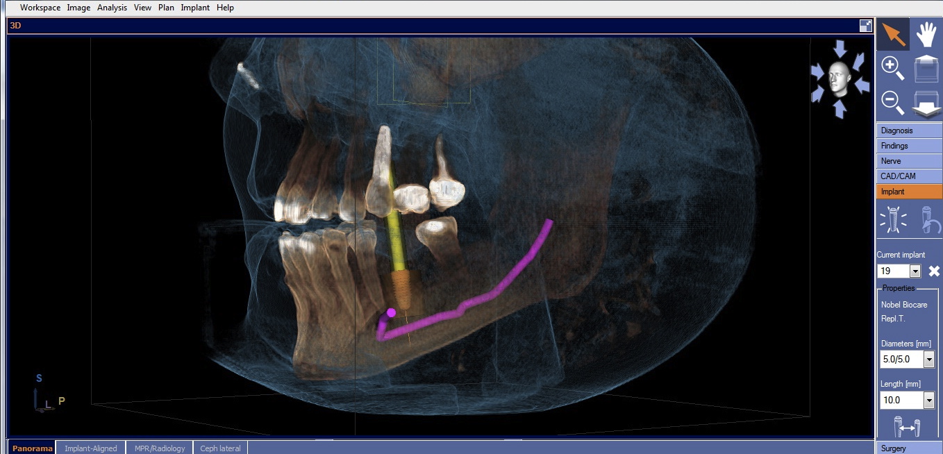 The software can now plan ideal implant placement based on the proposed restoration. The tooth being replaced will need to be identified, along with the implant brand/line, diameter, and length. Once the software digitally positions the implant, it can be repositioned, its length and width changed, and the implant line can also be changed.