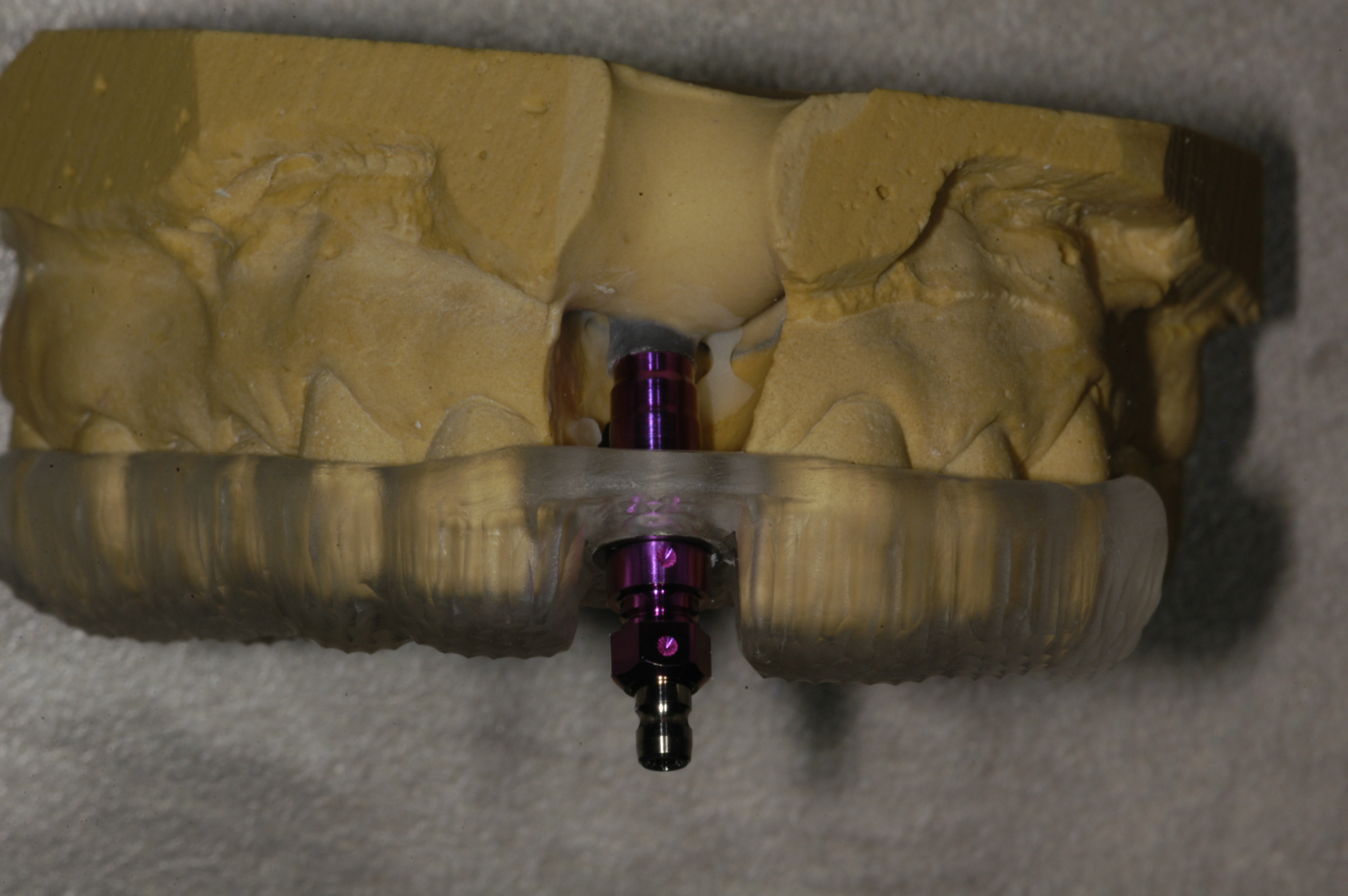 Before the surgical appointment, a provisional restoration can be made if an immediate load situation is anticipated. This is accomplished by retrofitting an implant analog into the patient’s model using the surgical guide. The analog is mounted on a guided implant mount and placed in the surgical guide. The guide is seated on the model after having removed stone to accommodate the analog. Stone is then flowed around the analog and allowed to set (Figure 4). To ensure that the implant ends up in the same position intraorally, an index of the implant mount in the guide on the model is made with polyvinyl siloxane (PVS) bite registration material (Figure 5). Next, a temporary abutment is placed on the analog, and a CAD/CAM crown is designed with a screw-access hole. The crown is bonded to the abutment and the provisional is complete. Alternately, an acrylic crown shell with a hole through it can be adapted over the temporary abutment.