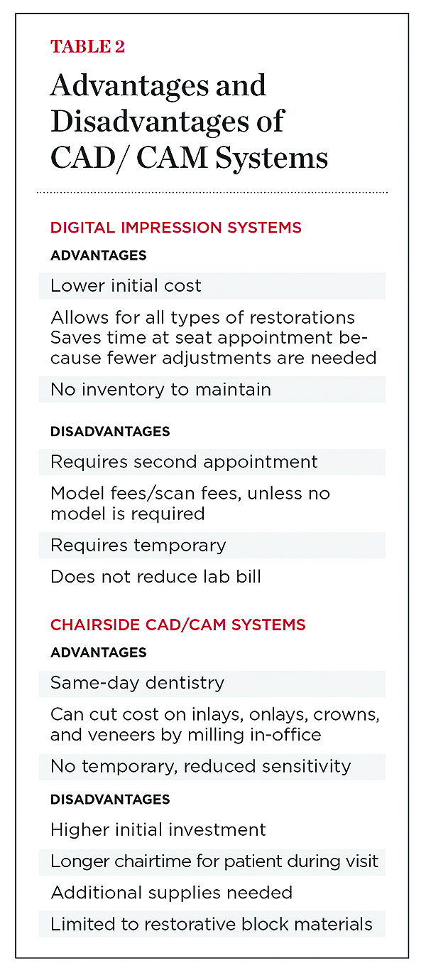 The advantages of chairside CAD/CAM systems are numerous; however, these systems are significantly greater in cost than a scanner alone, and require extensive training for the entire staff (Table 2). To attract clinicians who only want to use digital impressioning without milling, companies offer dentists an option to purchase the scanner without the mill, which provides additional options in materials and lowers the total investment. To choose which system is best for a particular office, a review of the type of restorative materials routinely used is a good start. If the majority of indirect restorations are ceramo-metal based, digital impressions may be the way to go. However, true return on investment can be achieved if an office is using all-ceramic materials routinely, especially in the posterior region.