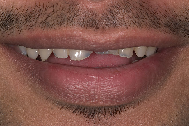 A 20-year-old male patient presented with irregular upper anterior teeth and was unhappy with his smile (Figure 4). He complained of occasional generalized mild sensitivity. Dental treatment history revealed that he had occasional dental work done in the past. Two weeks previously, he had severe pain in tooth No. 10, which was treated endodontically, and he was then referred to the author’s practice for management of anterior wear. Tooth No. 3 had a broken amalgam restoration.
