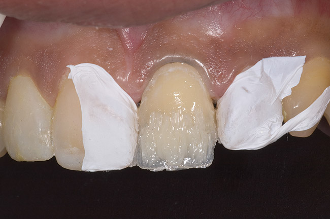 During the next appointment, a palatal index of the approved provisional was fabricated with putty silicone. This enabled the clinician to precisely build the lingual surfaces and incisal edges of teeth Nos. 6 through 11. The provisional mock-up resin on No. 9 was removed, and the underlying labial tooth was roughened with an abrasive diamond bur. No tooth structure was removed from the palatal surface, and unsupported enamel was rounded off from the labial. An ultrathin dry cord was placed in the gingival sulcus on No. 9 (Figure 9 and Figure 10). Teflon tape was used to isolate No. 9 from adjacent teeth. Then 37% phosphoric acid was used to totally etch the labial surface for 10 seconds and the palatal surfaces on No. 9 for 5 seconds. Single bond was applied and spread uniformly across the tooth and light-cured for 20 seconds.