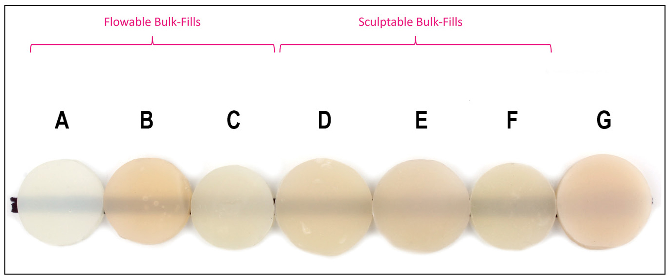Composite resins were developed in the 1950s as a bisphenol A-glycidyl methacrylate (bis-GMA) resin reinforced with silanated 150-µm ground glass filler particles. Over the course of the following 70 years, the major developments in the formulation of dental composites were reductions in the size of the filler particles, with most composites now containing all submicron-sized filler particles.6 Smaller filler particles allow a higher concentration of fillers to be added to a composite, resulting in better mechanical properties and lower shrinkage stress. Smaller filler particles also improve the esthetic properties of dental materials because the individual fillers are smaller than the wavelength of light and cannot be seen with the eye when the composite is polished.6 The most recent major developments in dental composites have been the introduction of bulk-filled composites, which are formulated as either modifying the composite resin or modifying the translucency of the composite.7 Figure 1 shows the translucency of several bulk-filled composites.