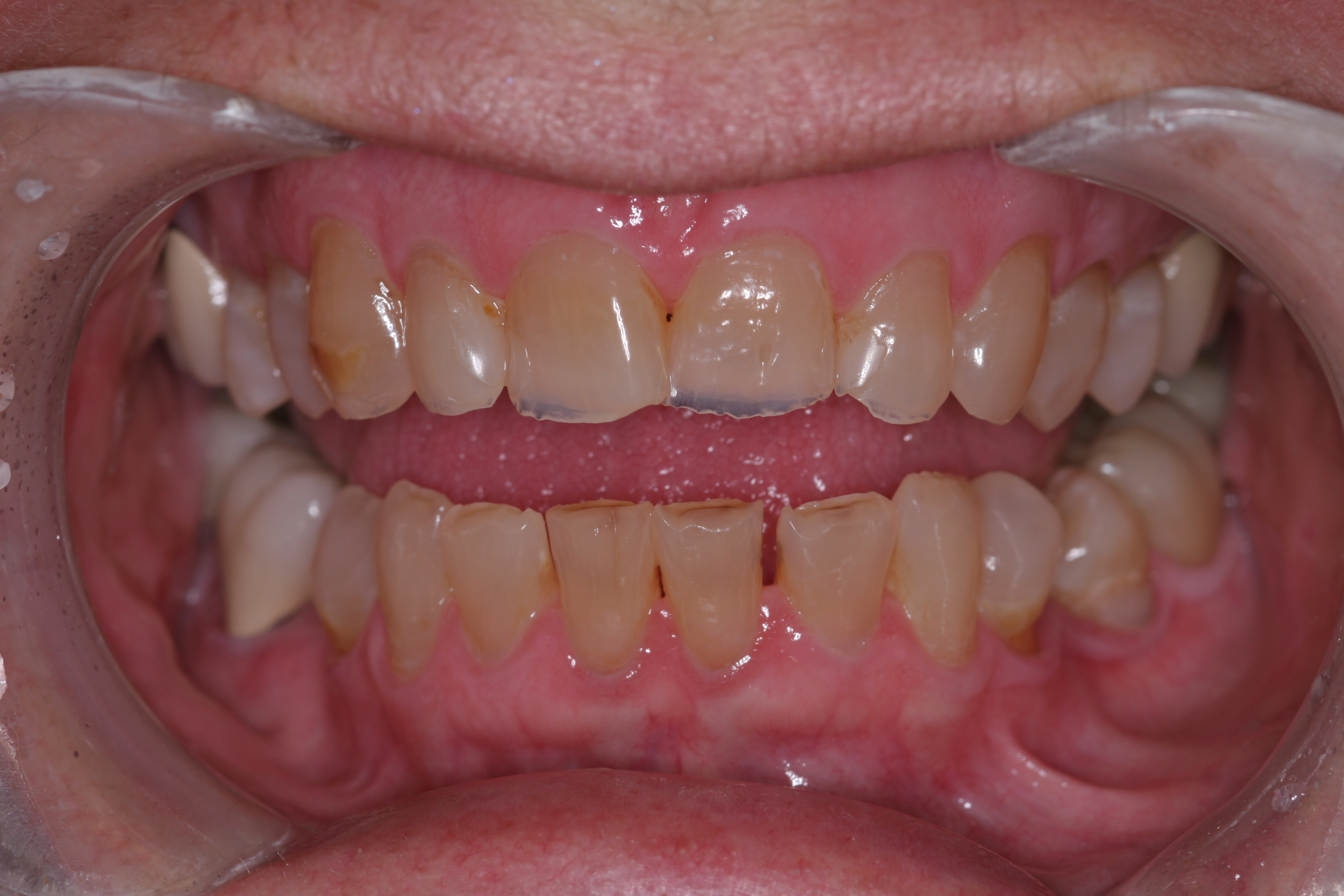 A patient presented with advanced generalized wear of her anterior teeth (Figure 10 and Figure 11). She was displeased with their overall appearance because of their color and wear (Figure 12). A complete examination was performed, revealing instability in her temporomandibular lateral poles bilaterally, sore muscles of mastication, advanced wear, a CR/MIP discrepancy, and loss of her anterior guidance due to the wear. Although the topic is beyond the scope of this article, the patient was also screened for possible sleep apnea. This included an evaluation of the Mallampati score, previous sleep therapy evaluation or treatment, snoring history, an evaluation of her neck size, her weight status, and the presence of the tonsils and their size. In every case, if this clinician suspects airway obstruction to be playing a role in tooth wear issues, the patient is referred to a sleep physician. The patient in this case displayed few apnea risk factors, and the patient’s anterior wear facets fit together like a “lock and key” pattern seen in parafunctional activity. Splint therapy was initiated to stabilize the joints and muscles. A repeatable CR position was verified through load testing. At this point diagnostic models, photographs, a CR bite record, and a facebow were taken and recorded.