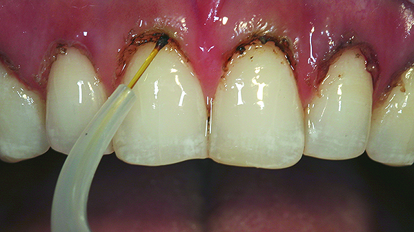 First, a full periodontal assessment was performed to determine gingival sulcus depth, position of biologic width, osseous crestal location, and periodontal biotype (Figure 19).27,28 Excess gingival tissue was then removed along the facial surface of teeth No. 3 to No. 14 with a diode laser (Figure 20). Because this was a combination-treatment case, laser-assisted gingival sculpting was the preferred treatment of choice. The diode laser cauterized the wound site, making same-day porcelain veneer preparations possible. To reestablish the biologic width apically, microsurgical diamond burs were used to reduce the vertical and horizontal crestal bone.29-33 Using this technique of flapless gingival surgery allows the patient’s healing time and pain to be minimal.
