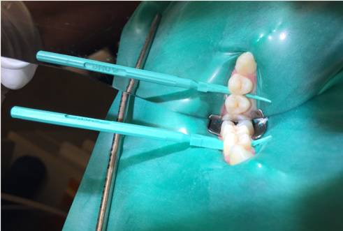 4. Remove the separator. If needed to accommodate the applicator, utilize one of the wedges provided in the proximal resin infiltration kit to create more space between the teeth (Figure 4).