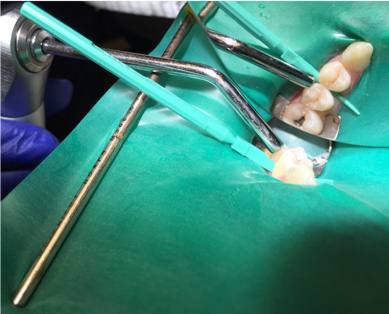11. Insert the applicator with resin infiltration material syringe attached, and the green, perforated side facing the lesion (Figure 8).