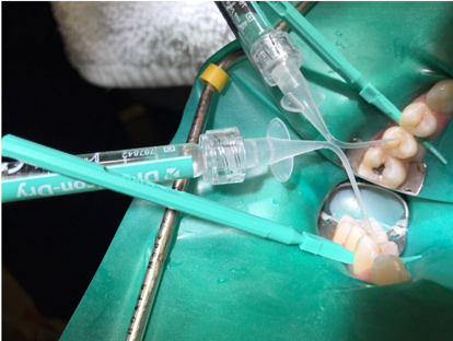 12. Twist the syringe and flood the lesion with the infiltrant for 3 minutes. Occasionally twist the syringe slightly to introduce more infiltrant into the contact, ensuring adequate resin is available as it absorbs into the lesion body.