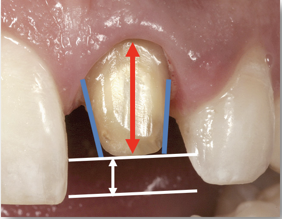 The most important factors to consider in preparing teeth for single-unit restorations are the taper (convergence), height (clinical crown height-how much tooth structure is above the gingiva and the height of the preparation), and reduction (Figure 1).6 Less than or equal to 20 degrees of taper or convergence is clinically appropriate. Overly tapered preparations will prevent the final restoration from being retentive. A preparation that is modestly parallel, while still achieving a good draw, is optimal. A 4-mm crown height is minimally adequate. If the height of the preparation is less than 4 mm, additional retentive features should be considered, such as slots and grooves in the preparation.