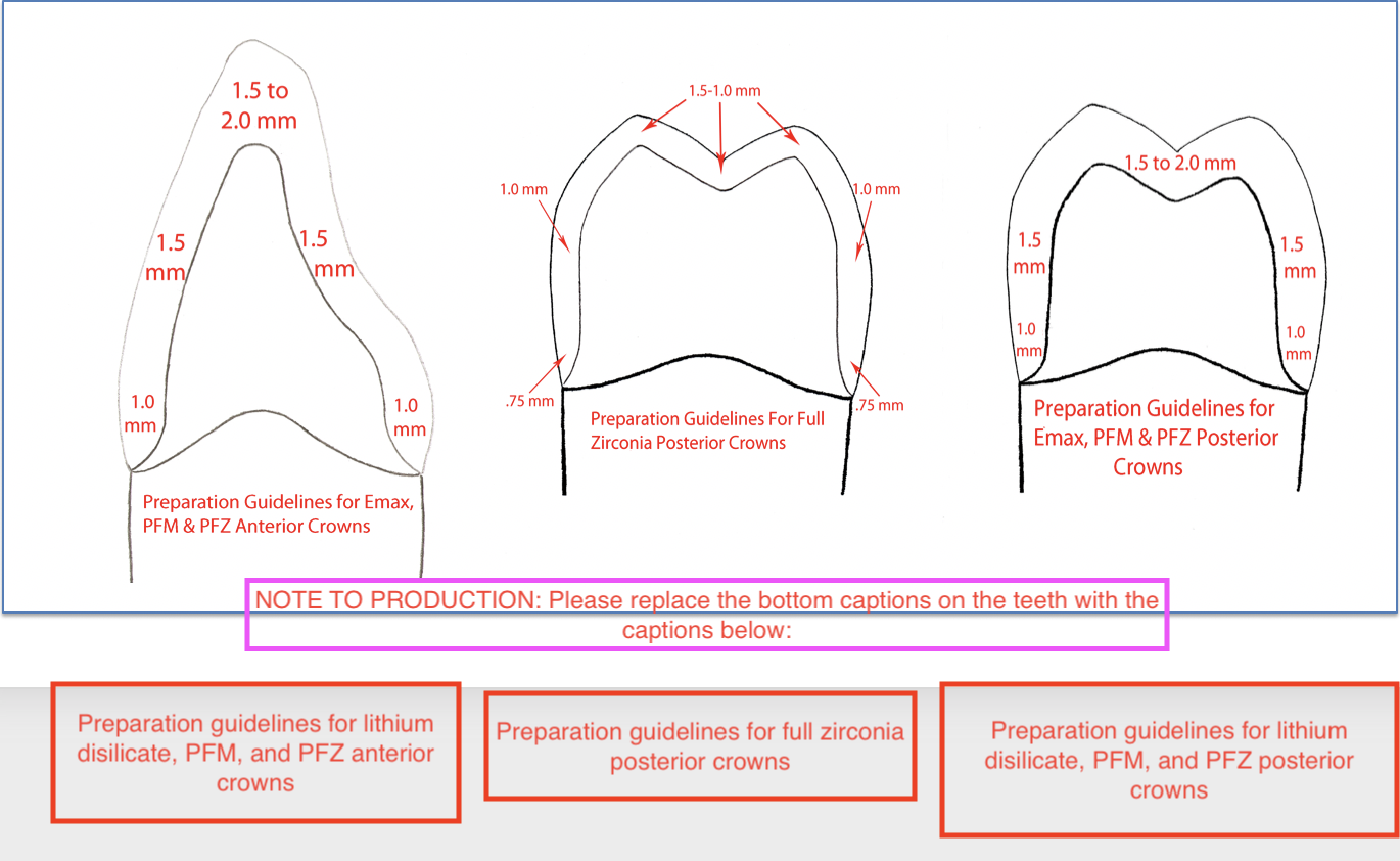 Tooth preparation should be performed as dictated by the type and substrate of the final restoration. Various types of restorations and substrates require different preparation methods. For example, lithium disilicate, porcelain-fused-to-metal (PFM), and porcelain-fused-to-zirconia (PFZ) anterior crown preparations require 1.5 to 2.0 mm incisally, 1.5 mm facially and lingually, and 1.0 mm at the cervical third facially and lingually. Full zirconia crowns in the posterior require 1.0 mm at the cusp tips, 1.5 mm occlusally, 1.0 mm buccally and lingually, and .75 mm at the marginal areas (gingival third of the tooth). Lithium disilicate, PFM, and PFZ posterior crowns require 1.5 to 2.0 mm occlusally, 1.5 mm buccally and lingually, and 1.0 mm at the gingival third or at the margin area (Figure 2).