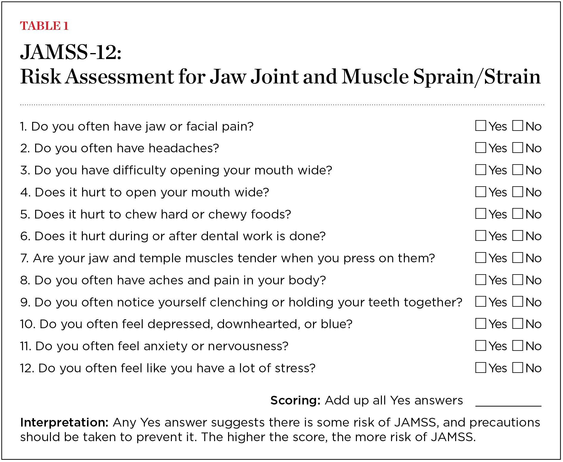 The JAMSS protocol employs a quick and easy-to-implement assessment—the “A” in SAFE—for determining preoperative risk, which can also function as a postoperative evaluation. The process starts with a 12-question verbal assessment with the patient, which generally takes just a few minutes (Table 1). Research suggests that the factors in this assessment are strong predictors of initial onset of TMD.5,7,9,10 The questions address pain on jaw opening, history of headache or facial pain, limited range of motion, emotional and general body factors, and potential stress.13-22