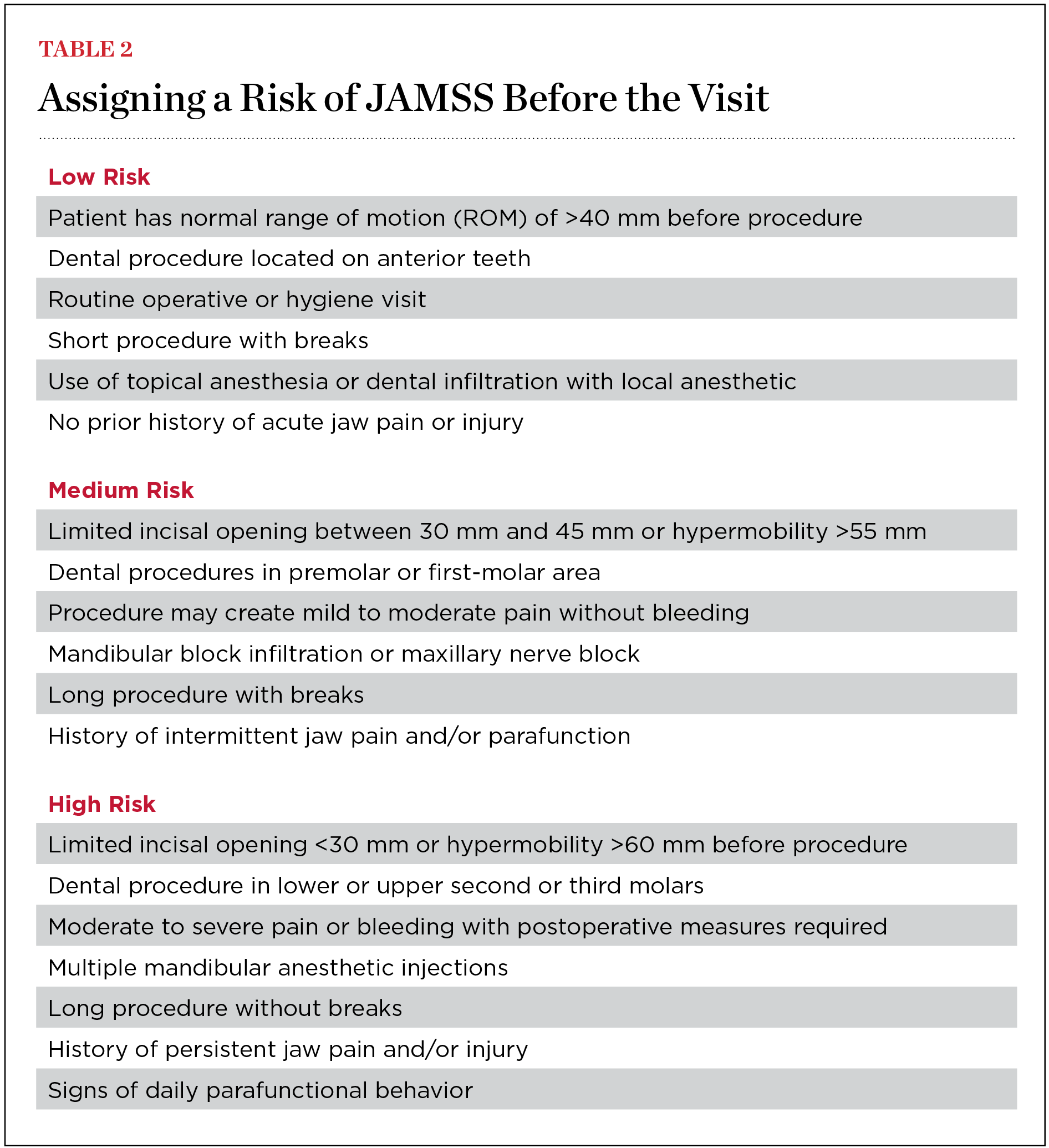 The last area of assessment involves dental procedures. Some initiating factors for development of JAMSS are direct trauma due to a nerve block, sustained or forceful contraction of the muscles that can be worsened by use of a bite block, hyperextension of the muscles due to opening too wide, or prolonged stretching of the muscles.2-4,7-10 These factors have been merged and distilled down to a few simple questions about the procedure to assign a risk category. In general, the further back in the mouth the clinician will be working, the longer the procedure, and the more downward pressure being put on the mandible, the greater the procedural risk.