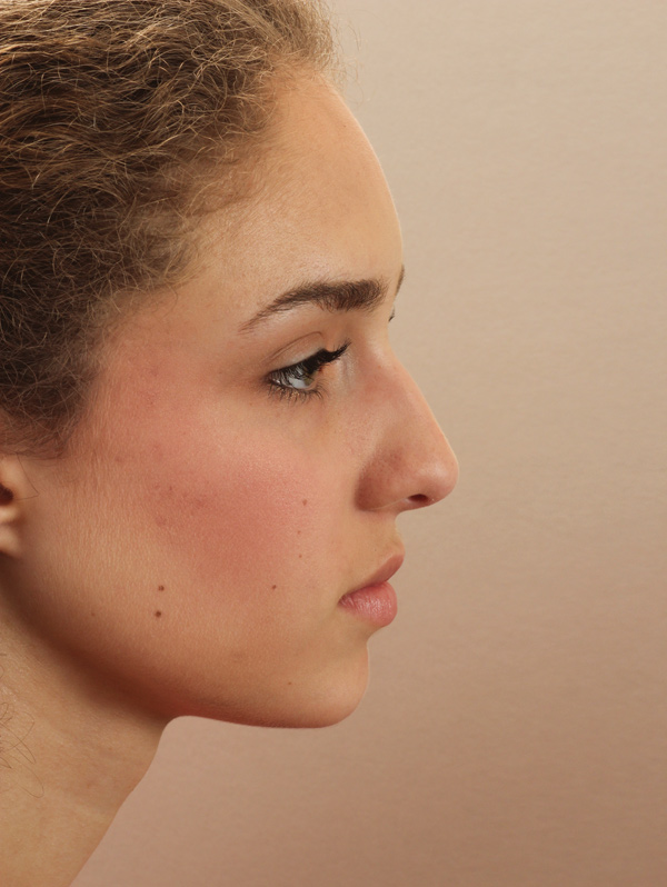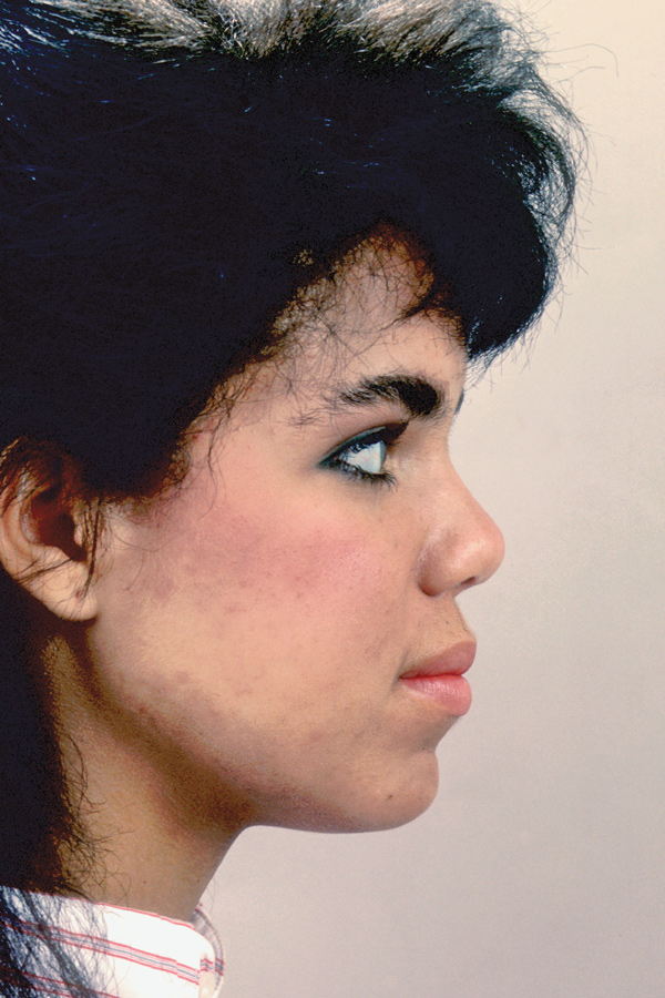 By age 12, she had maintained a mildly dentally protrusive appearance while acquiring her transitional dentition. In a “miniesthetic” evaluation, it was observed that she still had lip incompetence and slightly inadequate incisor display on smile. In addition, her gingival margins were shorter on the laterals and canines than they were on the central incisors. Her profile was characterized by more nasal growth, and she still had a moderately acute nasolabial angle (often associated with dental protrusion) and chin deficiency (Figure 6). Although there was significant crowding in the mandibular arch, with the space remaining, it could certainly be accommodated. But without permanent tooth extraction, the retraction of the anterior teeth and subsequent reduction in protrusion was estimated to be minimal. Was she following the same path as her mother who ultimately required premolar extraction? The fact that the young girl had a similar build as her father and other indications that she was going to experience a lot of growth had to be taken into account when planning her orthodontic treatment. The goal of her orthodontic treatment was to improve the class II malocclusion, but at the same time maintain anterior incisor position for lip support. How this was discussed with her parents was fairly simple and did not require sophisticated technology or cephalometric analysis. After bringing the profile image up on the computer screen, everything below the upper lip was blocked from view (Figure 7). This demonstrated that the upper face and upper lip appeared to be quite normal in isolation and that her profile convexity was due to the moderate deficiency of the mandible and, in larger part, the chin. The same exercise can be performed from the frontal view to visualize her lip support in that dimension. At the conclusion of the conversation, a treatment plan was selected that involved nonextraction treatment in combination with headgear for class II correction through growth modification. In other words, the plan was to maintain the middle and upper soft-tissue position while improving the lower face. At the appropriate age (usually 15 years or older in females) when the soft tissue was appropriately mature, the patient would be reassessed for possible chin augmentation through an inferior border osteotomy.