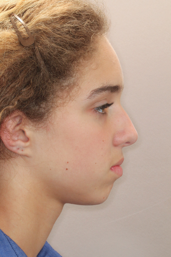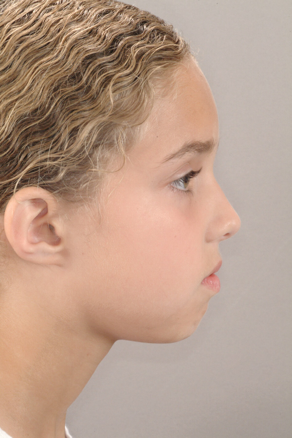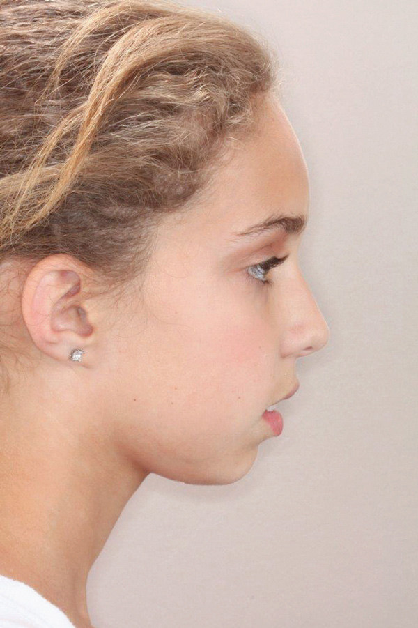 After 20 months of orthodontic treatment and having attained the occlusal goals, the orthodontic appliances were removed and she was placed into retention. Her profile demonstrated even more nasal growth, resulting in the increased facial convexity that was expected (Figure 10). At age 15 (the appropriate time for 3rd molar removal), both the mother and the patient expressed their desire to have the chin augmentation via the inferior border osteotomy performed at the same time as the 3rd molar removal because the oral maxillofacial surgeon is required to perform both procedures. After surgery, the resulting profile was well-balanced with a good lip and chin relationship and a pleasing labiomental sulcus (Figure 11). Furthermore, her frontal facial proportions were excellent and the lip support was ideal (Figure 12). Choosing to perform an inferior border osteotomy instead of using an implant to augment the chin results in an increase in bone thickness on the anterior aspect of the lower incisors, which is an additional periodontal benefit.16,17