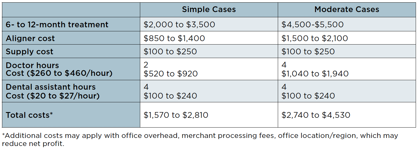 Most patients are focused on cosmetic care and often do not want to start other restorative work unless their cosmetic concerns are also being addressed at an affordable price. Without the hybrid clear aligner model in place, dental practitioners often try to accommodate the patient by greatly reducing the aligner treatment pricing. When practitioners use these tactics, they generally do not take into consideration the negative financial impact from potential merchant or extended service fees, clear aligner laboratory bills, auxiliary expenses, and chair time, etc. (Table 1).
