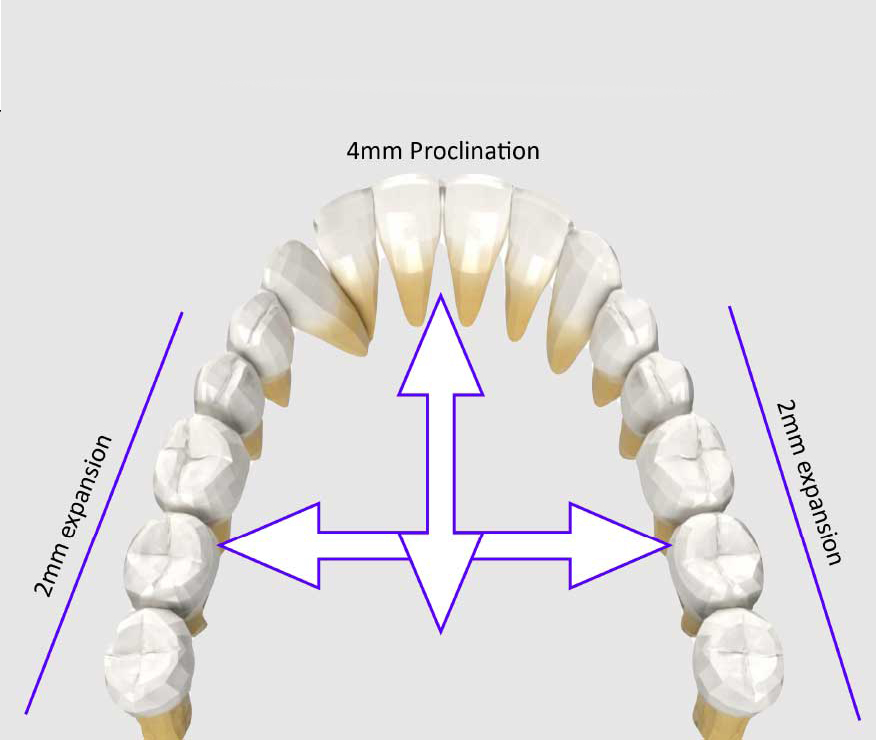 When discussing tooth movement concepts with the patient who opts for aligner therapy, it is always best to convey the esthetic and functional goals of the treatment based on clear aligner capacities. Orthodontic tooth movement results from resorption and formation of the alveolar bone in response to the application of load.10 Typically, each aligner is preloaded to achieve approximately 0.25 to 0.30 mm of load. With clear aligner therapy, teeth can be moved forward and tucked back lingually if necessary, keeping the root apices within the bone but tipping in multidirectional movements to gain better esthetic alignment. In some cases, teeth can be moved linearly, but this will be considered a translation movement and exceed the mild to moderate teeth movements. Cases of anterior crowding of 4 mm or less can be treated without attachments and without interproximal tooth reduction (IPR), and instead by adding posterior expansion of 2 mm, yielding better anterior esthetics without the proclination of the lower anterior arch beyond 4 mm (Figure 5). The root apex position remains the same, with only the crown portion of teeth being proclined buccally or lingually. In some cases, anterior overlapping/crowding may need IPR when sufficient space cannot be created for teeth movement alone by posterior expansion and anterior proclination.