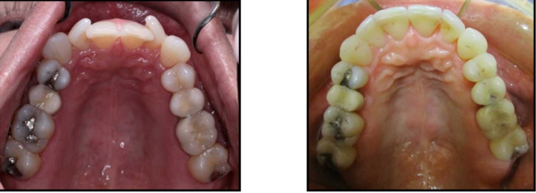 A 58-year-old male patient presented with a chief concern of overlapping maxillary and mandibular lateral incisors (Figure 6 and Figure 7, left panels). The patient's treatment options were reviewed, and clear aligner therapy was chosen. Given the 2,4,6 rule of the aligner parameters set by the clinician, posterior arch expansion of 4 mm with the added anterior proclination of 2.5 mm in the upper arch was implemented. Because the lateral incisors were rotated less than 25 degrees (Figure 6, left panel), additional attachments were not needed. By uprighting and expanding the upper arch from premolar to molar regions, which can be expressed as posterior arch expansion, rotation of the lateral incisors into better anterior arch position was allowed. As the upper lateral incisors rotated into better position, a visible incipient decay was noted mid-treatment on the mesiolingual surface of tooth No. 10. This incipient caries, which was not clear on the 2D radiographs nor visible during the examination, was restored while the overlapping of the lateral incisor over the adjacent central incisor No. 9 was corrected, and the patient was spared potential further degradation of the tooth structure. Thus, clear aligner treatment was able to provide the patient with good results without the need for IPR treatment and helped achieve better oral health (Figure 6, right panel).