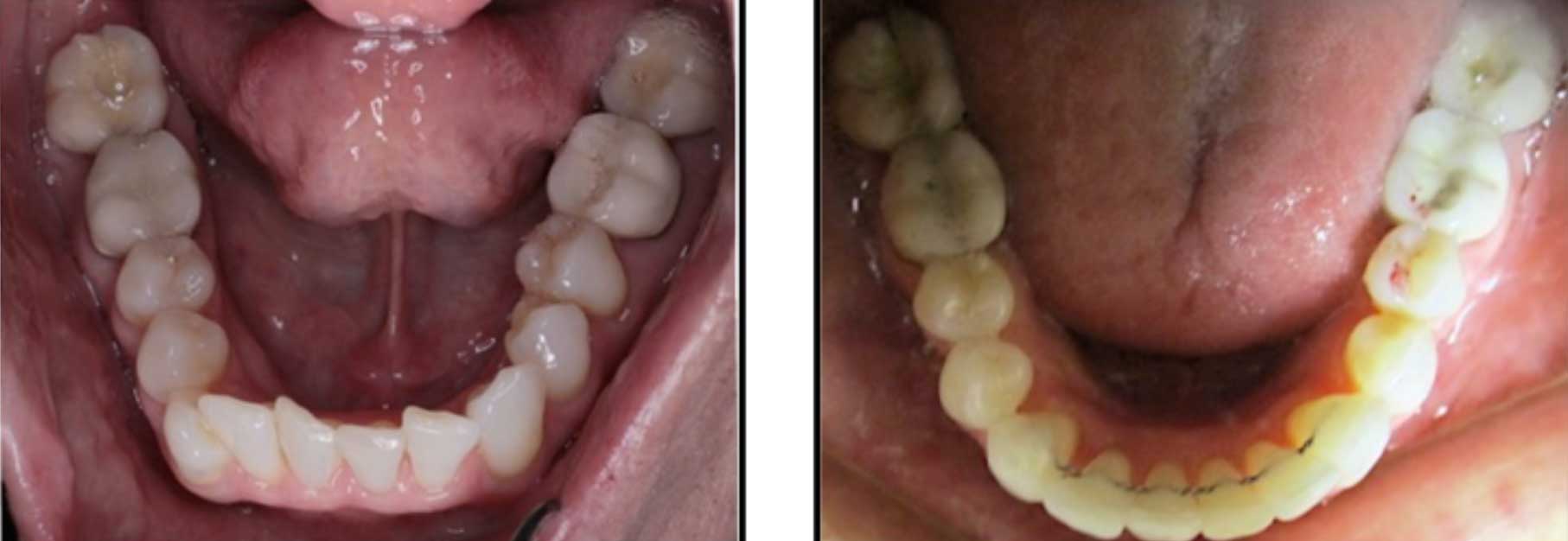 A similar strategy was followed for the same patient's lower anterior malocclusion requiring posterior arch expansion, creating room for the lower anterior arch alignment (Figure 7, left panel). Using clear aligner therapy, the same parameters as in the upper arch were followed by bicuspid to molar teeth uprighting, creating an expansion of 1.5 to 2 mm in each posterior quadrant, along with an approximate anterior proclination of 2 mm. After less than 1 year of treatment, the patient was moved into bite stabilization with no active tooth movement for 6 to 8 weeks, finishing the upper and lower arch in 1 mm overjet and overbite on the anterior arch coupling (Figure 7, right panel). A final retention option of lingual lower wire and clear upper aligners was used for 24 months, prior to moving into all-removable retention and night-time wear. The patient has been pleased with the treatment of his chief concern and has been in a "positive" mindset, becoming an advocate of the clinician, the practice, and the process.