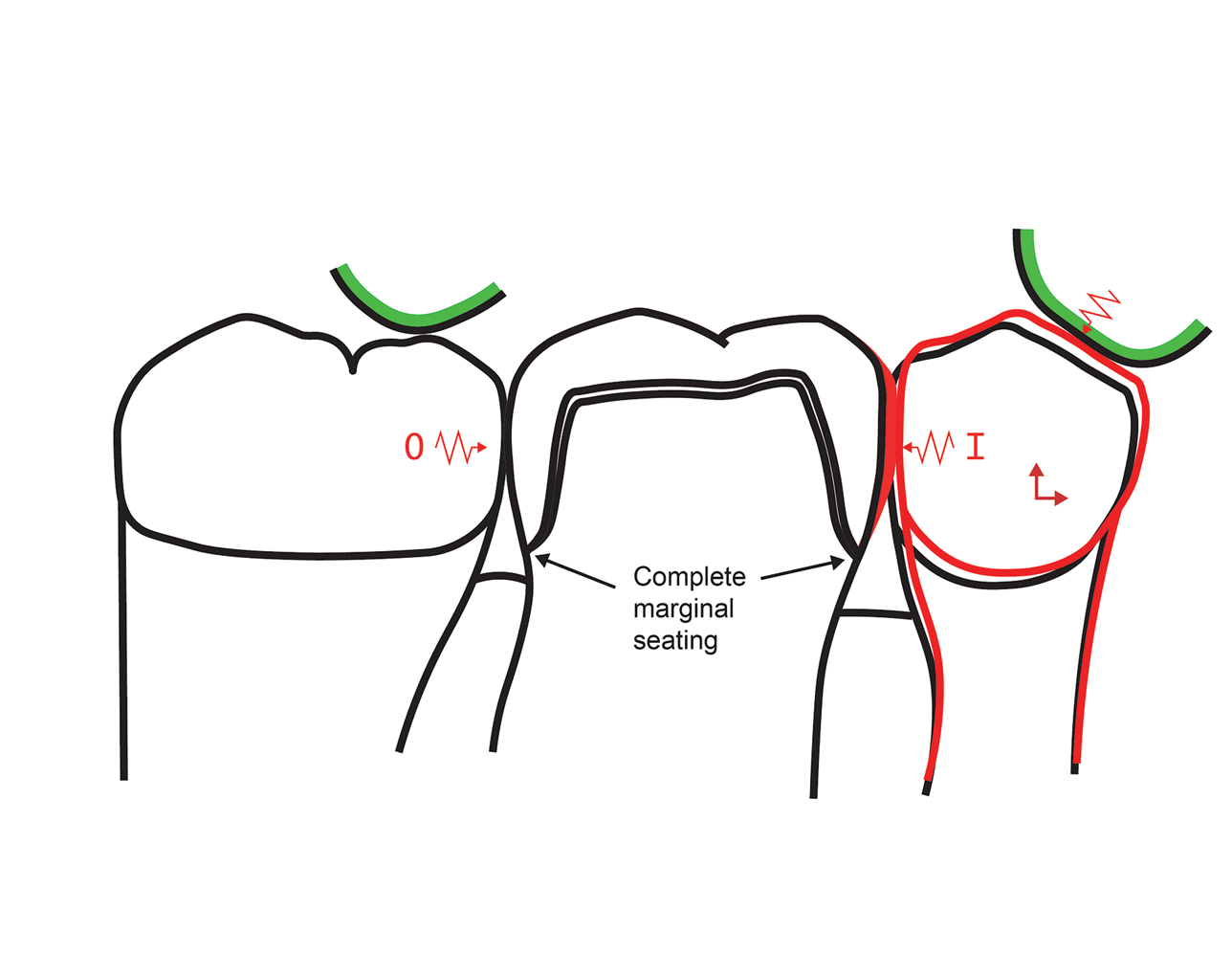 In Class I, adequate interproximal relief is achieved on only one side, and the interproximal contact on the other side is slightly heavy (Figure 2). When passing a shim stock sheet or thin diamond strip through both the mesial and distal interproximal spaces, significantly higher friction is generated on the side with the heavy interproximal contact. In Class I, a crown may still be able to be completely seated under moderate finger pressure; however, lateral pressure is being created on the side with the heavy interproximal contact, which may cause vertical or horizontal displacement of the abutment tooth or the adjacent tooth. Therefore, although the seating and marginal adaptation may seem appropriate, interproximal contact adjustment is required prior to proceeding to occlusal evaluation.