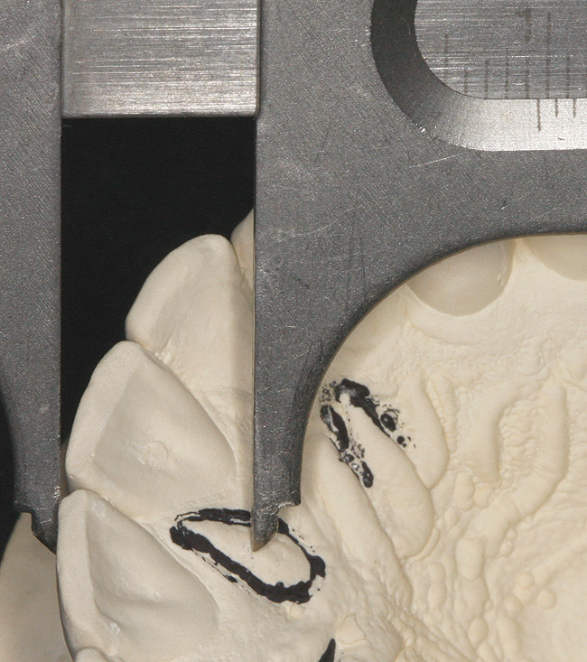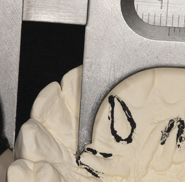 1. Take an arbitrary length (eg, 3 cm) and mark a point (with a pencil) on the labial art-form of the maxillary cast (from the wax occlusion rim surface) to correspond to the position of all six maxillary anterior teeth.