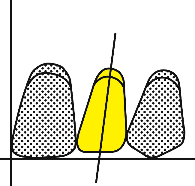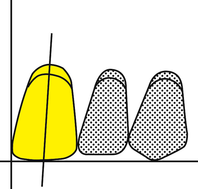In Figure 18 and Figure 19, the maxillary central incisor is placed so that the long axis shows a slight distal inclination to the perpendicular. The incisal edge is on the occlusal plane (level of the lip line at rest, or 1 mm to 2 mm below and/or beyond the lip line). The neck of the tooth should be slightly depressed. However, the facial surface of the tooth is nearly perpendicular to the occlusal plane. Consequently, when viewing the incisor from an occlusal view (perpendicular to the occlusal plane), the middle third of the facial surface is most prominent.