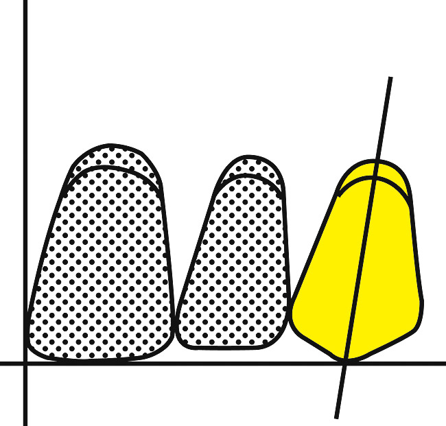 The dental midline is recorded in the maxillary wax rim. The marking should be both coincident with the facial midline and vertically straight. This position often corresponds to the maxillary labial frenum.28 The initial setting of the anterior teeth is consistent with the established wax plane of occlusion. Besides using techniques discussed previously, various laboratory devices, such as an occlusal plane indicator, can also provide assistance with the vertical positioning of the maxillary anterior teeth. Figure 18 through Figure 24 show the long axis of each tooth (broken line) and the orientation that the teeth should take in the wax occlusion rim (solid line). This mnemonic can help in remembering the bucco-lingual inclination of the maxillary anterior teeth (labial surface, from an occlusal view): M-I-G (middle third for the central incisor, incisal third for the lateral incisor, and the gingival third for the canine).2,27,29