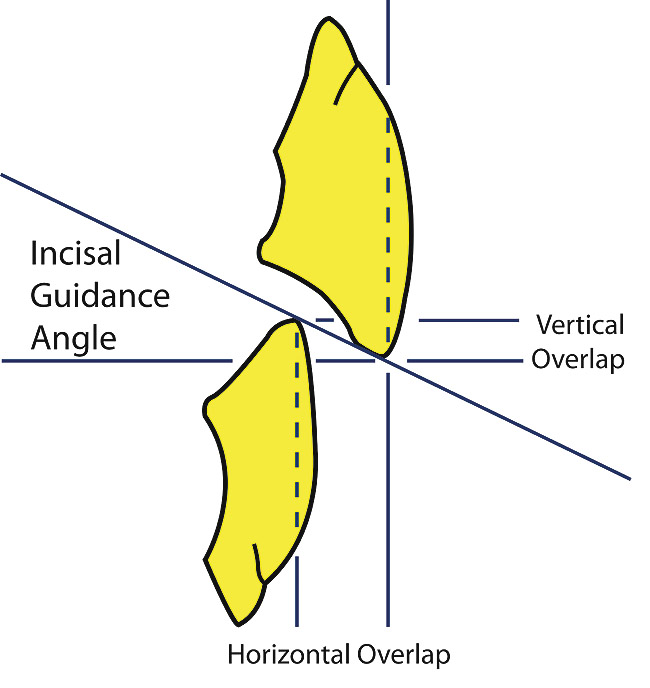 With a lingualized occlusal set-up, the incisal guide table is set to the angle of the lower posterior teeth.2,27,29,30