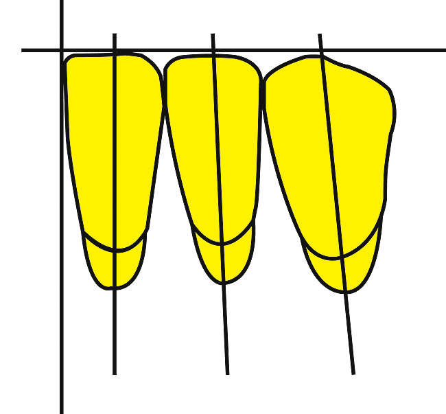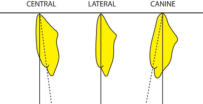 In Figure 20 and Figure 21, the maxillary lateral incisor has slightly more distal inclination than the central incisor. The incisal edge is usually 0.5 mm to 1 mm above the occlusal plane. The neck of the maxillary lateral incisor is depressed more than the central incisor, although the labial surface will be nearly in line with the central incisor. Consequently, when viewing the lateral incisor from an occlusal view (perpendicular to the occlusal plane), the incisal third is most prominent.