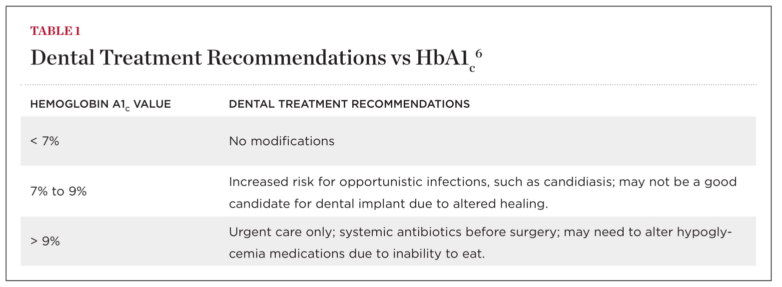 A patient with well-controlled diabetes can tolerate any dental treatment and will have fewer complications systemically.1 Dental healthcare providers should reinforce excellent glycemic control and lifestyle when these patients receive oral care. Two blood tests are commonly used to monitor glycemic levels: glycated hemoglobin (A1C or HbA1c) and blood glucose (random or fasting). Most patients are encouraged to perform self-monitoring of blood glucose testing, especially those using insulin injections.2