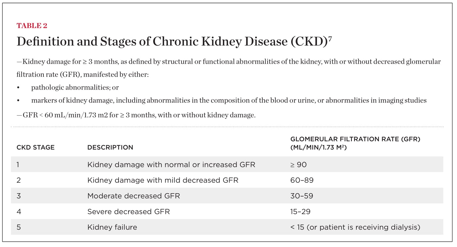 Chronic kidney disease (CKD) is characterized by the kidneys’ inability to adequately eliminate metabolic (nitrogenous) waste via the urine, regulate acid-base and electrolyte balance and bodily fluid volume, reabsorb protein, secrete the hormones renin and angiotensin (which are responsible for the maintenance of blood pressure), and synthesize erythropoietin and the active forms of vitamin D. The National Kidney Foundation (NKF)’s Kidney Disease Outcomes Quality Initiative (KDOQI) Guidelines define CKD as either kidney damage or glomerular filtration rate (GFR) < 60 mL/min/1.73 m2 for 3 or more months (Table 2).7 Kidney damage is defined as pathologic abnormalities or markers of damage, including abnormalities in blood or urine test results or imaging studies. The NKF KDOQI Guidelines also include a system for staging chronic kidney disease based on GFR (Table 2). The complex signs and symptoms that occur in patients with untreated, severe persistent renal failure are known collectively as uremic syndrome or uremia.