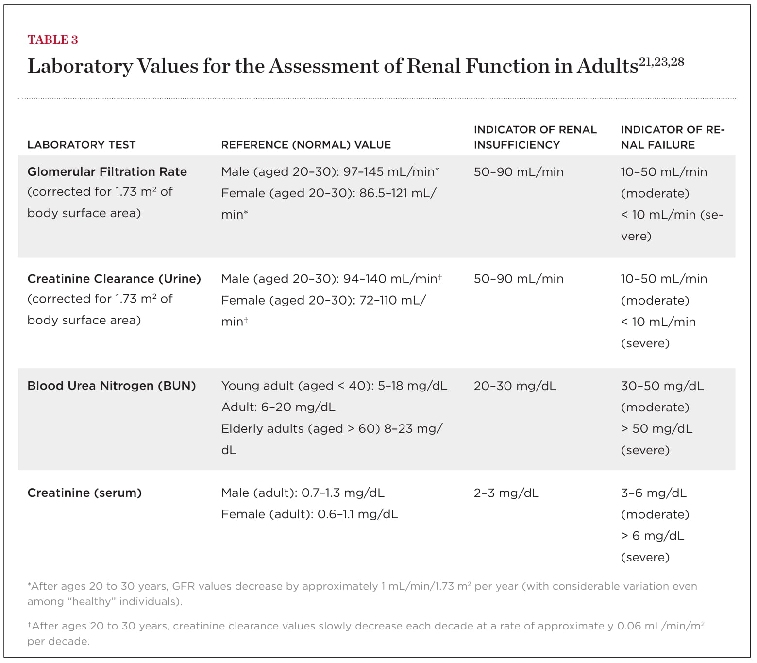 The primary laboratory tests that can provide an indication of renal function and consistent results include decreased GFR, decreased creatinine clearance in the urine, increased blood urea nitrogen, and increased serum (plasma) creatinine (Table 3). Additional laboratory test results that would be considered supportive in the confirmation of advanced CKD typically include decreased serum calcium with increased serum phosphate/inorganic phosphorus, increased serum potassium, decreased serum chloride, decreased serum sodium, increased serum uric acid, increased serum alkaline phosphatase, decreased serum bicarbonate, and decreased venous blood total carbon dioxide.28 The principal test used to measure renal function and to gauge CKD severity is GFR, which provides an excellent indication of the filtering capacity of the kidneys.28 A low or decreasing GFR is a good indicator of CKD. GFR cannot be determined directly and is traditionally measured as the renal clearance of a particular substance, or marker, from plasma. Inulin is a fructose polymer, and inulin clearance was once widely regarded as the “gold standard” for measuring GFR. Inulin clearance measurements in healthy, hydrated young adults (adjusted to a standard body surface area of 1.73 m2) have mean values of 127 mL/min/1.73 m2 in men and 118 mL/min/1.73 m2 in women with a standard deviation of approximately 20 mL/min/1.73 m2.29 GFR declines with age. After 20 to 30 years of age, GFR decreases by approximately 1 mL/min/1.73 m2 per year with considerable variation between “healthy” adults.30