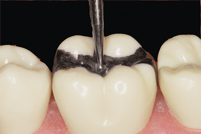 An end-cutting diamond bur is then used in the interproximal box area to eliminate any abrupt dimensional vertical/horizontal platform-to-wall transition changes (Figure 10). Sharp line angles tend to accumulate stress and should be avoided.23 Rounded internal line angles minimize stress concentrations.24,25
