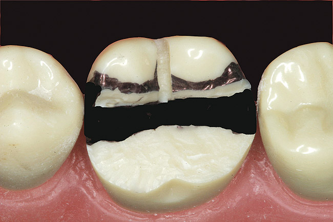 As previously stated, the ceramic thickness is critical to the success of the restoration. A 2-mm flexible clearance tab can be placed over the occlusal surface of the prepared tooth and the patient instructed to close into centric occlusion. If sufficient reduction has been provided, the flexible tab should easily pull through. Any resistance encountered is then identified and corrected.