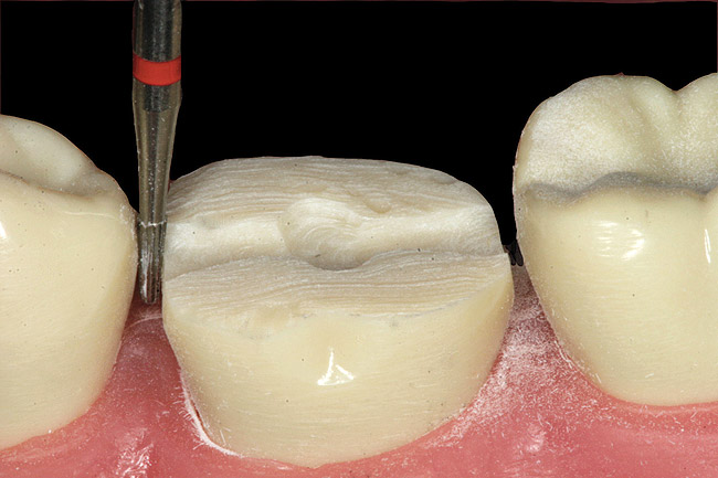Many clinicians were taught full-crown preparation principles that included resistance and retention form gained from axial wall reduction. These principles were taught before the advent of adhesive dentistry. A paradigm shifthas occurred in the preparation requirements for adhesively retained all-ceramic crowns. Some dentists may be reluctant to fully accept the retention strength of adhesives and feel that their crown preparations must still include the retention and resistance form principles that were ingrained into them while in dental school. Traditional crown preparations actually remove the tissue—enamel—a material with which adhesion works so well. A split section of an intact molar will show from an axial perspective that there is a wide band of enamel located in the supra-bulge area approximately halfway down the clinical crown while the thinnest amount of enamel is located at the gingival margin. Therefore, traditional crown preparation that includes axial reduction will actually reduce the surface area of enamel, decreasing the bond strength of the restoration that is gained by the enamel substrate.1 An alternative approach to the traditional crown preparation is non-retentive, adhesively retained “table-top” crown preparation. In select cases, it allows for maximum preservation of the enamel, reducing the amount of tooth preparation and creating more supra-gingival margins. Therefore, the “table-top” preparation actually increases the amount of surface area of bondable enamel, thus increasing the bond strength of the restoration to tooth substrate.