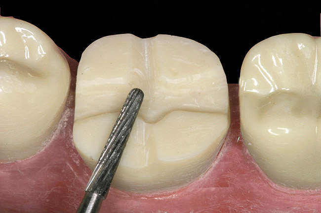 The following steps show the progression of the “table-top” preparation for a typically encountered molar with a large 3-surface amalgam and that has been diagnosed with “cracked tooth syndrome.” For instructional purposes, in this article the steps are performed on a dentaform model. Understanding that this media represents the ideal scenario will give the reader a better visual of the steps involved using this particular preparation sequence. Whether to cover the cusp or not is a clinical decision. However, in their study, Krifka et al found that thin non-functional cusp walls of adhesively bonded restorations should be completely covered or reduced to avoid enamel cracks and marginal deficiency.21 As a general rule, cuspal coverage may be indicated where the remaining tooth structure is less than one-third to one-half of the intercuspal distance.1,22