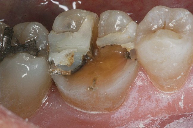 It is not uncommon to find fractures at the axial-pulpal line angles after removal of a large MOD amalgam. In fact, Fennis et al8 found in the Dutch population fractured cusps occurring at a rate of 20.5 per 1000 examined. His group found that the incidence was associated (77%) with three or more restored surfaces and the occurrence was found more in molars (79%) than premolars (21%). Maxillary molars presented more fractures of buccal cusps (66% versus 34%), while mandibular molars presented more fractures of lingual cusps (75% versus 25%). Bader et al9 found in their study of restored posterior teeth two clinical features that were strongly associated with the risk of cusp fracture. The proportional size of the restoration and the presence of a fracture line were indicators for posterior fractures. The type of direct restorative material does not seem to play a role in the increased occurrence of previously restored posterior teeth. Wahl et al10 did not find a significant difference in the number of cusp fractures in teeth restored with amalgam versus composite, although in the general practice it may seem more fractures are found associated with amalgam-restored than composite-restored teeth. The fact that amalgam restorative has been in service longer and more teeth have been restored with amalgam may account for this observation.