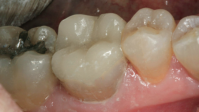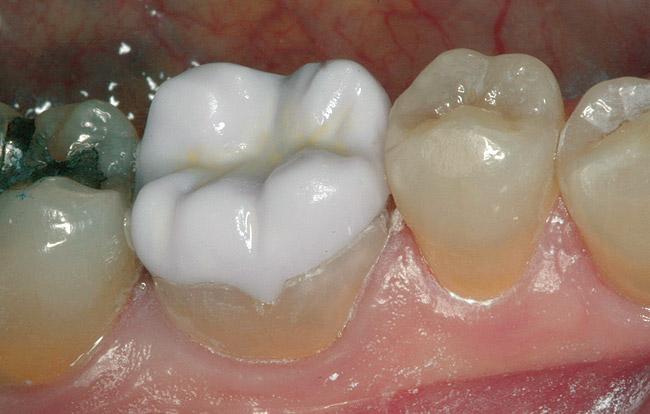 When a tooth has been treatment planned for a full-coverage restoration, a traditional crown preparation is usually the procedure of choice. Kois states that cases that require cuspal protection but still maintain significant structural integrity in an axial dimension may be suited for an adhesively retained restoration.1