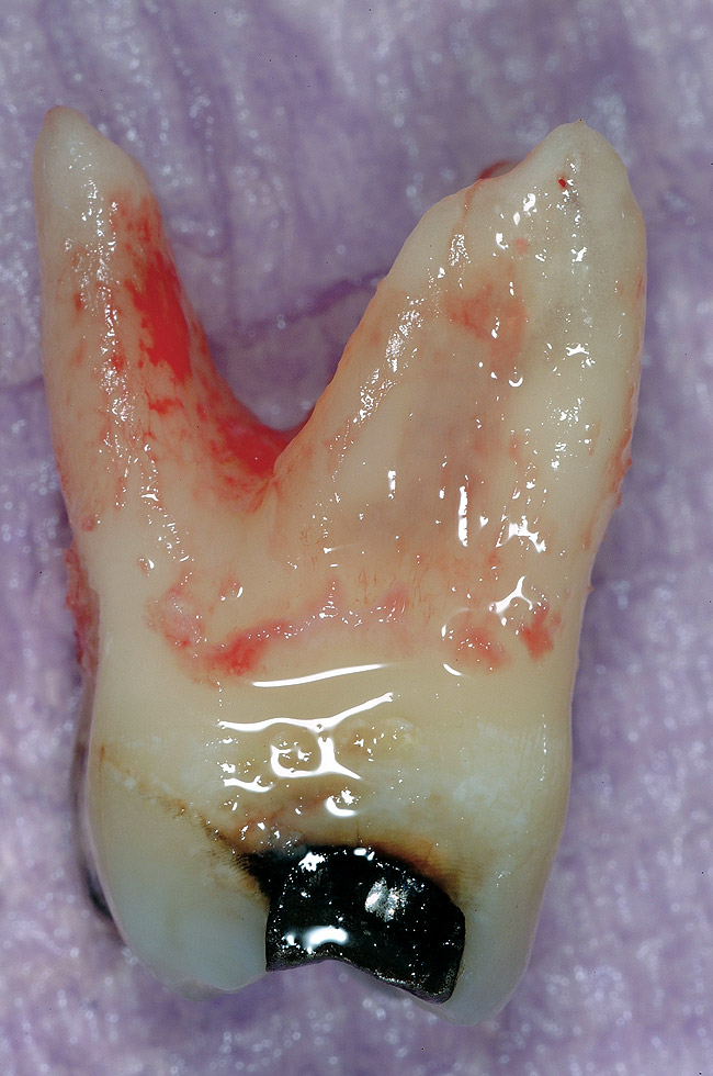 Figure 1 shows a radiograph of a typical maxillary first molar. Upon extraction, the apical anatomy was immediately studied and photographed under a global microscope ( Figure 2, Figure 3, Figure 4, Figure 5 and Figure 6). That is a take-home lesson; the extracted teeth should be studied with loupes or microscopes. These photographs demonstrate an important lesson. The two-dimensional radiograph shows three roots. In reality, however, a significant percentage of maxillary first and third molars—80% in some studies—have four roots and four or more canals. 1,2 While the MB and MP (MB-2) roots are usually fused, their morphology is unique. For diagnostic, access, and shaping purposes, it is safer to think of them as separate roots. Wisdom teeth often exaggerate the anatomic features of first and second molars, and a significant percentage of maxillary third molars have four distinct roots. The author's personal bias is to consider most maxillary first the radiographic apex of the tooth. The use of the radiographic root apex for use as the reference point for measuring the apical extent of the root filling is the common standard, yet has been criticized because of the poor correlation between the location of this point and the actual canal foramen. 5 The illustrations used in advertising and manufacturer's "tip cards" only further the notion of simple foramen anatomy. While simple anatomy is often the case with incisor teeth, a quick perusal of the posterior teeth in Brown and Herbransen's Dental Anatomy & 3D Interactive Tooth Atlas demonstrates that a significant portion of the foramen exit short of the apex and have multiple foramina. 6 The same extracted tooth in Figure 2 demonstrates that the palatal foramen is more than a millimeter short of the radiographic apex. If this tooth were filled to the constriction, which for arguments sake is 0.75 mm from the foramen, a straight-on radiograph would depict the fill as being at least 2 mm "short."