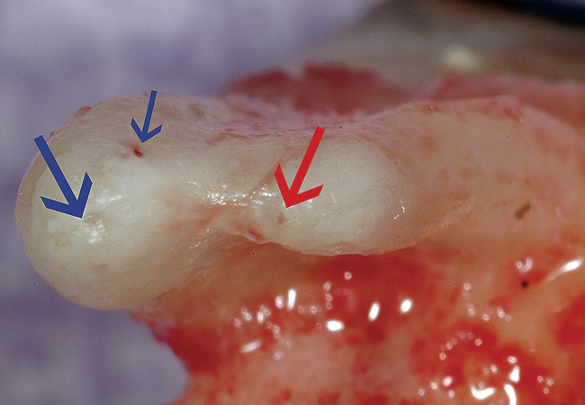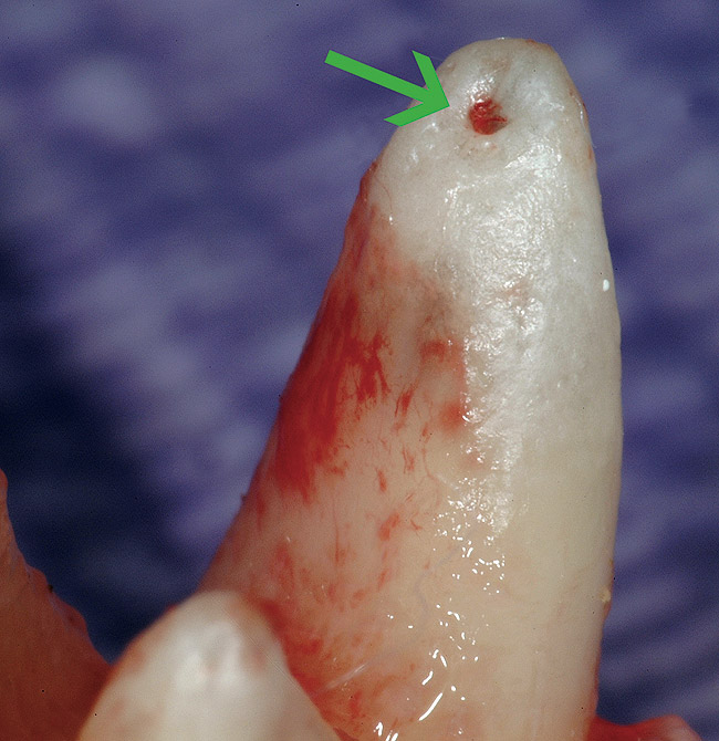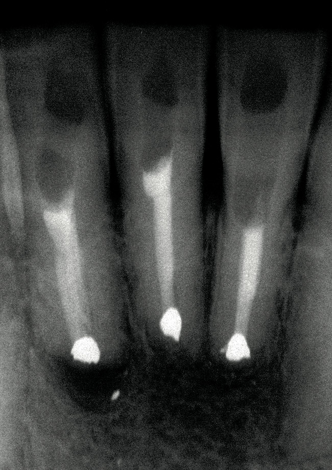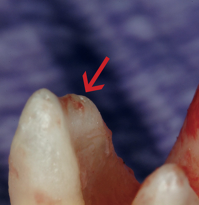 When a tooth appears completely calcified on the radiograph, it is often assumed there is no pulp tissue in that portion of the tooth. Evaluating the research reveals that this bias is unfounded. 11-13 Although radiographs may reveal what appears to be a total obliteration of the pulp canal, there generally remains clinical evidence of a pulp canal and pulpal tissue. 14-16 It is crucial to eliminate this bias, due to the errors and gouging that follow such a flawed mental model.