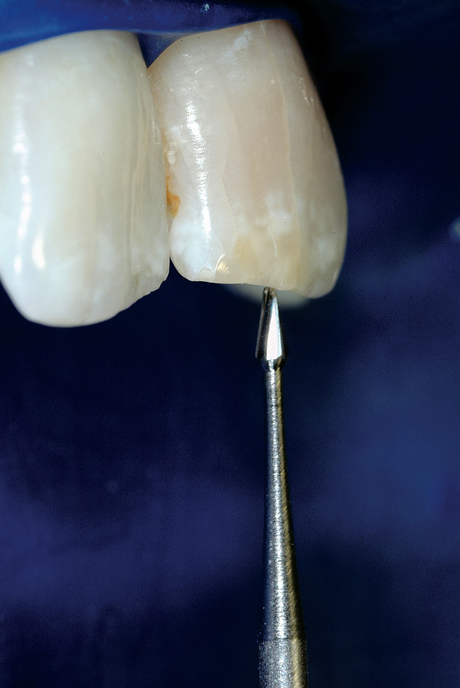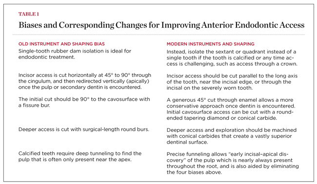 The old bias of horizontal primary access that intersects the dentinal map in the middle of the crown deprives the clinician of this incredibly useful and important landmark, that of the old pulp horn. Additionally, the old bias requires a 90° turn from horizontal to vertical, which invariably leads to facial gouging and other more subtle problems. Each step of the access should lay a foundation for success and prevention of gouging. There are five critical biases and the accompanying changed access principles demonstrated in the feature case, which are outlined in Table 1.