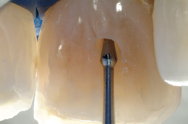 The first step in the access for the calcified tooth is the establishment of the palatal–incisal notch ( Figure 15 and Figure 16). Once the area where the original pulp chamber was located has been accessed, it is advisable to take an orientation verification radiograph or multiple angled radiographs ( Figure 17). The palatal–incisal notch works in concert with the narrow shaft of the bur to perform important tasks. Similar to a surgical stint for implant drilling, the notch first stabilizes and directs the head of the bur by cradling the shaft. Secondly, it allows a more appropriate angulation—toward the incisal—of the back of the bur. Anatomy lessons have taught clinicians that the root and the crown of incisors are not parallel.